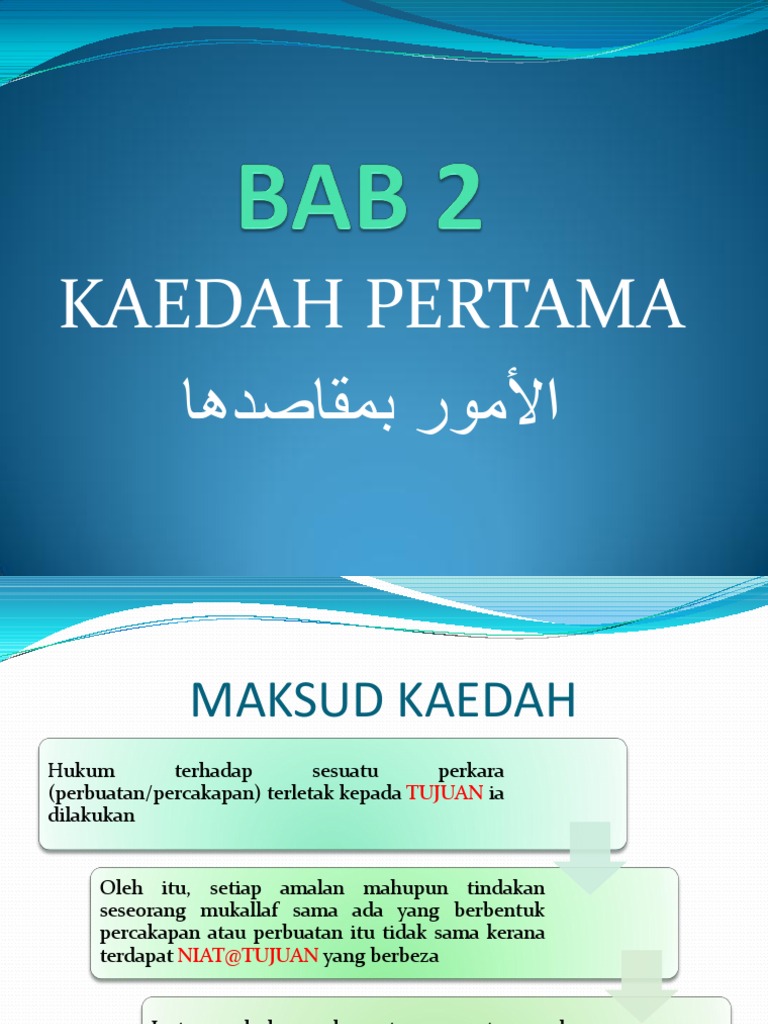 Kaidah al-umur bi Maqashidiha terdiri dari dua kata yakni al-umur dan al-maqashidLafadz al-umur diartikan sebagai tingkah laku atau perbuatan seorang mukallaf yang berupa ucapan perbuatan itikad dan meninggalkan sesuatuLafadz al-maqashid merupakan bentuk jama dari bentuk mufrod maqshud yakni bentuk mashdar dari lafad qashada secara bahasa qashada berarti menyengaja. Pengertian kaidah AL Umuru bi Maqosidiha. Rafidah Mohd Azli 1 Rohana Othman 2 Mardhiyyah Sahri 3 Nooraslinda Abdul.